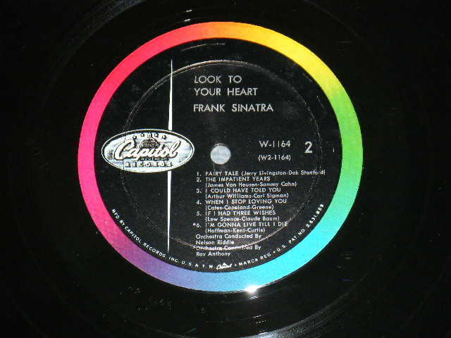 OTHERS : | <Release Information> 1959 US AMERICA ORIGINAL 1st Press "BLACK with RAINBOW and CAPITOL Logo at LEFT" Label STEREO Used LP Others Information VERY HARD-TO-FIND!!!! | A1 | | Look To Your Heart | | A2 | | Anytime-Anywhere | | A3 | | Not As A Stranger | | A4 | | Our Town | | A5 | | You, My Love | | A6 | | Same Old Saturday Night | | B1 | | Fairy Tale | | B2 | | The Impatient Years | | B3 | | I Could Have Told You | | B4 | | When I Stop Loving You | | B5 | | If I Had Three Wishes | | B6 | | I'm Gonna Live Till I Die |