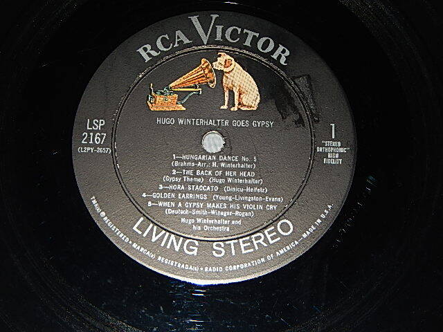 OTHERS : | <RELEASE INFORMATION> 1959 US AMERICA ORIGINAL 1st Press "BLACK with SILVER PRINT 'LIVING STEREO' at Bottom Label" STEREO Used LP Others Information | A1 | | Hungarian Dance No. 5 | 2:49 | | A2 | | The Back Of Her Head | 3:05 | | A3 | | Hora Staccato | 3:14 | | A4 | | Golden Earrings | 3:43 | | A5 | | When A Gypsy Makes His Violin Cry | 3:04 | | B1 | | Francesca | 3:14 | | B2 | | Csárdás | 4:25 | | B3 | | Zigeunir | 3:11 | | B4 | | Gypsy Don't You Cry | 3:50 | | B5 | | Gypsy Love Song | 2:57 |