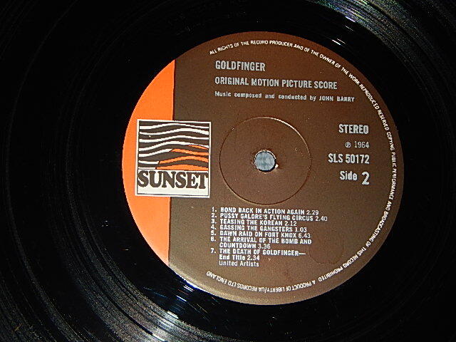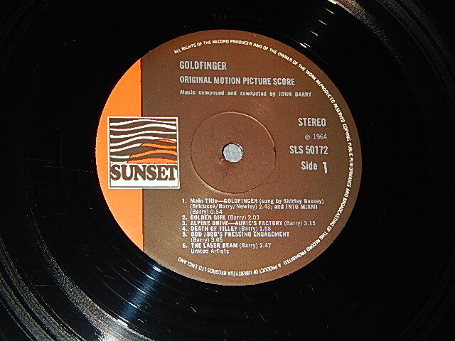 OTHERS : | <RELEASE INFORMATION> 1973 Version UK ENGLAND REISSUE STEREO Used LP Others Information ULTRA RARE !!! 1st RELEASE ! | A1.1 | | Main Title - Goldfinger | 2:43 | | A1.2 | | Into Miami | 0:54 | | A2 | | Golden Girl | 2:03 | | A3 | | Alpine Drive - Auric's Factory | 3:15 | | A4 | | Death Of Tilly | 1:58 | | A5 | | Oddjob's Pressing Engagement | 3:05 | | A6 | | The Laser Beam | 2:47 | | B1 | | Bond Back In Action Again | 2:29 | | B2 | | Pussy Galore's Flying Circus | 2:40 | | B3 | | Teasing The Korean | 2:12 | | B4 | | Gassing The Gangsters | 1:03 | | B5 | | Dawn Raid On Fort Knox | 6:43 | | B6 | | The Arrival Of The Bomb And Countdown | 3:36 | | B7 | | The Death Of Goldfinger - End Titles | 2:34 |